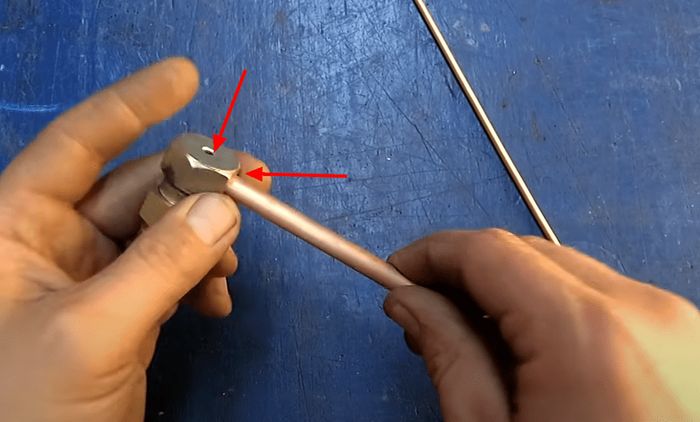 Теперь в монетке сверлим отверстие для медной трубочки. Затем затягиваем её в болт и при помощи шуруповёрта обрабатываем монетку так, чтобы она свободно проваливалась в сопло будущей горелки. Если монетка свободно двигается после того, как затянули штуцер, то его торец можно немного сточить.
