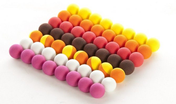 - Цвет. Имеет значение только в прозрачной воде. Карп чаще всего клюёт на красные, жёлтые и фиолетовые шарики. Если вода слишком мутная, цвет приманки большого значения не имеет.