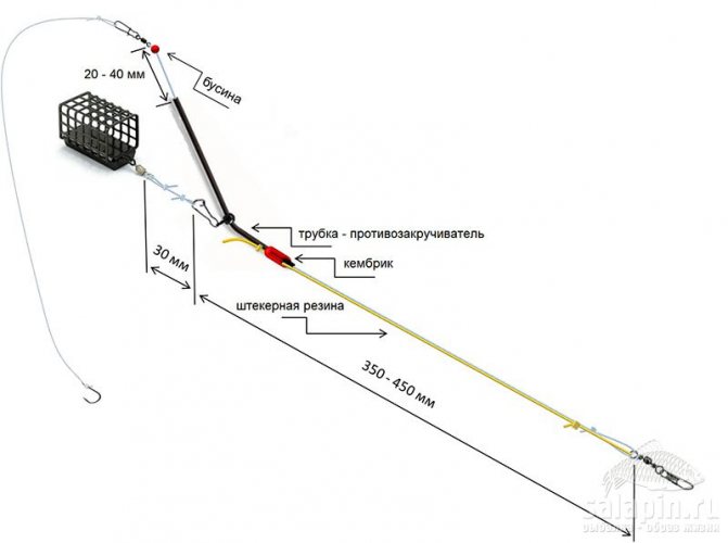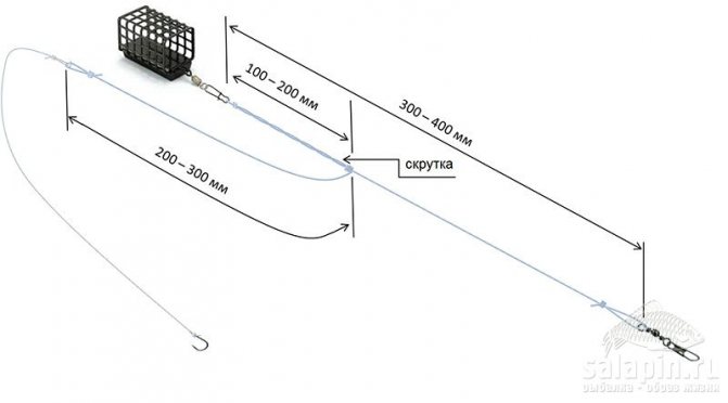 Кормушки в этой оснастке можно использовать любой формы. Поводок не должен быть длинным, т. к. эта оснастка имеет склонность к перехлестам.