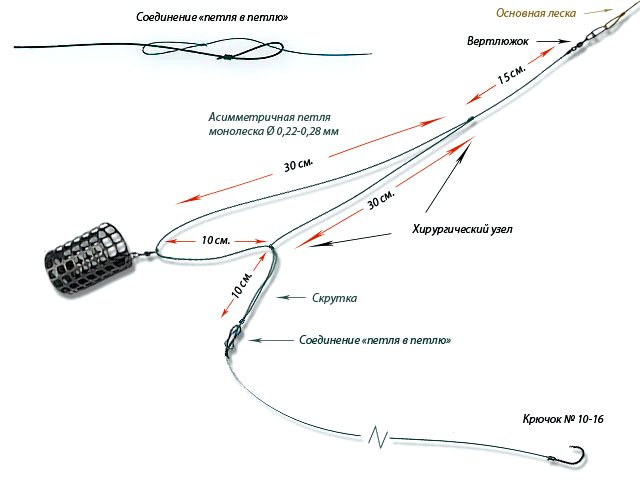 Сначала на основной леске вяжут хирургическим узлом петлю под кормушку диаметром около 20 см. Вторая петля — вяжется под поводок с крючком. Ее вяжут на конце лески либо хирургическим узлом, либо клинчем. Диаметр такой петли — около 5 см (можно и меньше. Лишняя леска обрезается. Ловить с такой оснасткой можно, как на водоемах с течением, так и в спокойной воде. Оснастка хорошо работает даже в условиях каменистого дна или глубокого ила.