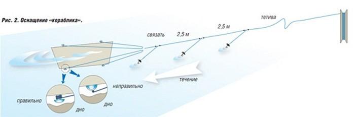 - На длинную, основную леску крепиться несколько поводков с приманкой, а на другой конец крепится сам кораблик. Постепенно приманка вымывается, и рыба подплывает к нужному месту лова.