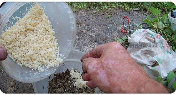 Прямо на рыбалке в эту основу заливают водой и добавляют глину или грунт. Из полученной массы лепят шары или заряжают ею кормушки.