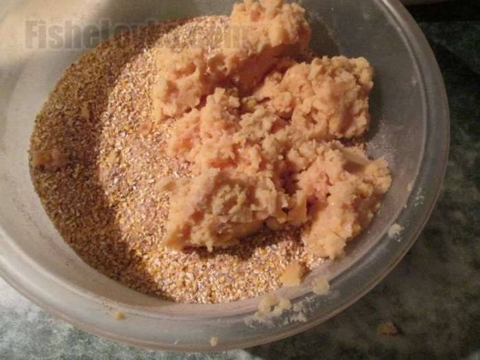 Сухари и крупы необходимо перемешать и залить небольшим количеством теплой воды. Воду стоит лить постепенно, чтобы смесь получилась слегка увлаженной. После этого в массу добавляется жмых, желатин, мед и измельченный собачий или кошачий корм. Прикормка готова.