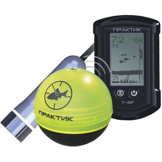 Эхолот Практик 7 RF представляет собой комплект состоящий из беспроводного датчика Практик 7 Маяк и блока отображения информации Практик 7 RF. Связь между беспроводным датчиком и блоком отображения информации Практик 7 RF осуществляется по Bluetooth на расстоянии до 120 метров. Блок отображения информации эхолота Практик 7 RF оснащен суперморозостойким дисплеем размером 30 на 50 мм, с диагональю 2,4 дюйма и разрешением 128 х 64 точки. Питание блока Практик 7 RF осуществляется от литий-полимерного аккумулятора. Время работы эхолота от одной зарядки аккумулятора до 40 часов.