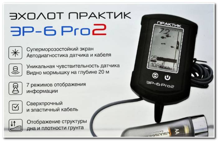 Эхолот Практик ЭР-6 PRO2 является улучшенной версией эхолота Практик ЭР-6. Эхолот оснащен суперморозостойким дисплеем размером 30 на 50 мм, с диагональю 2,4 дюйма и разрешением 128 х 64 точки. Дисплей оснащен равномерной подсветкой. Чувствительность эхолота Практик ЭР-6 PRO2 увеличилась на 30-40% по сравнению с предыдущей моделью. Эхолот оснащен функцией автодиагностики датчика и кабеля, улучшен режим определения структуры дна, улучшен алгоритм определения рыбы, добавлена автоматическая регулировка контрастности дисплея, эхолот стал более экономичным в энергопотреблении.