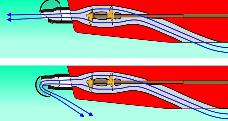 - Вода поступает в расположенный в передней части лодки водозаборник. Он снабжен сеткой, которая отфильтровывает водоросли и плавающий в воде мусор. Конструируя водозаборник, инженеры стремятся обеспечить ламинарное течение воды в нем, так как наличие турбулентности на подходе к винту значительно ухудшает характеристики двигателя.