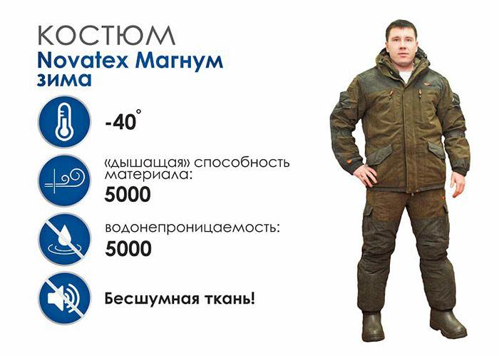 Костюм имеет широкий выбор размеров, обладает хорошей водонепроницаемостью, хорошо выдерживает сильные снегопады, оттепели и попадание в воду. Он не продувается ветрами, на рукавах имеются удобные регулировочные липучки, которые с легкостью заменяют стандартные манжеты. К рукам прижимаются не слишком плотно – эта проблема хорошо решается с помощью рыболовных перчаток.