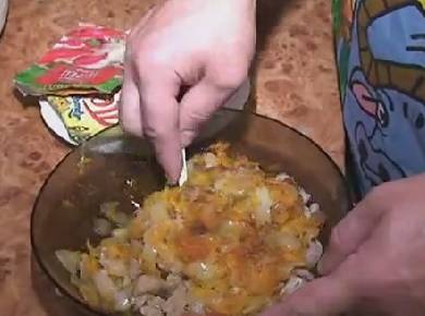 Обжариваем её до прозрачности, добавляем 1-2 чайные ложки соли. Снимаем с огня.