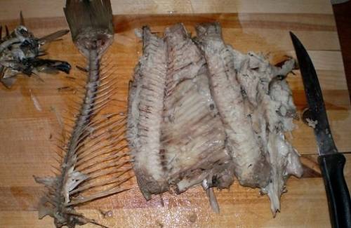 Важно извлечь все кости – хребет вынимаем вместе с большими, а мелкие вытаскиваем с помощью пинцета. Разрезать на порционные куски необходимо острым ножом, таким образом они получатся ровными