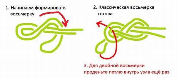 Есть также вариант «Восьмёрки», позволяющий связывать 2 лески друг с другом. Один конец складывается, образуя цифру «8», а другой продевается в петли, повторяя витки, как показано на схеме.
