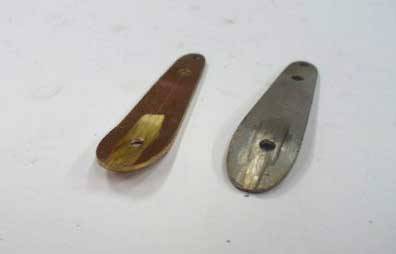 Первым делом необходимо вырезать заготовки из листов металла. Затем нужно просверлить в них три отверстия — два под заклепки и еще одно, расположенное в верхней части блесны — под заводное кольцо. Через отверстие, расположенное в нижнем конце приманки, будет крепиться крючок, место его расположения нужно выбирать, исходя из этого. Также необходимо просверлить болгаркой углубления, в которые ляжет цевье.