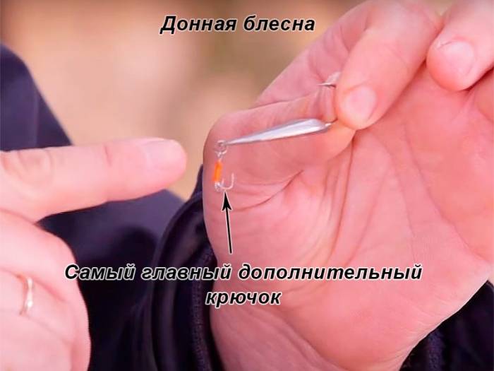 Кроме того, у донных блесен есть дополнительный крючок. Он располагается в верхней части, и как правило, именно верхний крючок является главным.