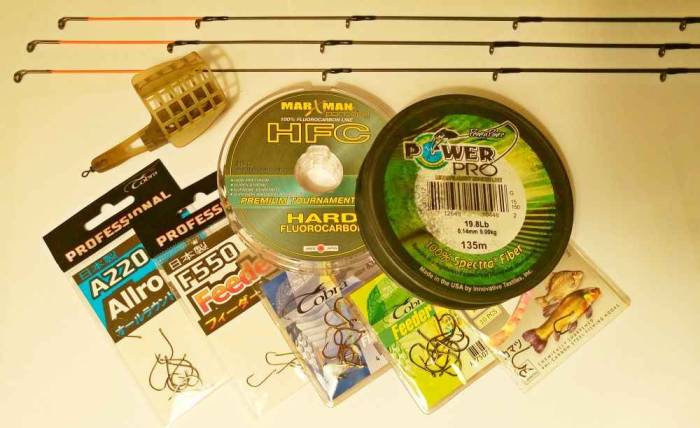 Для обычной ловли на дистанциях до 60 метров удобно использовать лайт и медиум фидеры. Течения в местах ловли нет, и тяжелые кормушки не требуются. Хэви варианты фидера могут потребоваться только для дальних забросов на широких мелководных заросших прудах и озерах. Оснащение фидера зависит от дальности заброса и веса кормушки. Чаще используются средние и легкие пикерные варианты оснасток фидера.