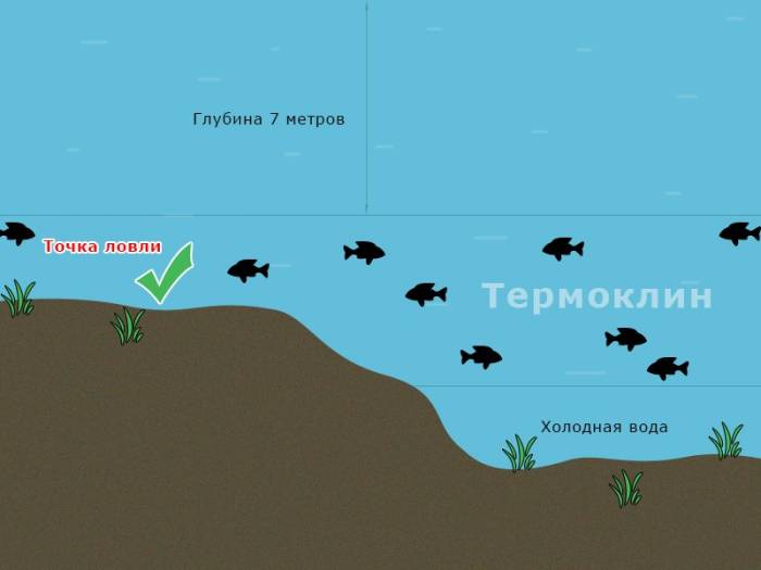 Очень часто термоклин встречается на глубинах 7 – 8 метров, реже бывает и на 5 метрах. Так вот, если вы встали на точку, которая ниже термоклина, то с большой вероятностью, рыбы там не будет. Там холодно, нет кислорода и рыбе нечем дышать, летом в таких местах, рыба не живет.