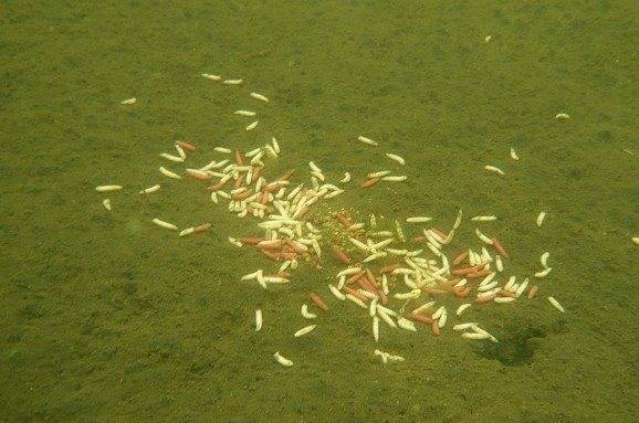 Я помню, что в самый первый раз (в жизни) я наблюдал под водой за опарышами – именно на гравийном дне. Мы тогда забросили на дно пару горстей опарышей (в пакете PVA), сделали несколько снимков и удалились (приблизительно) на полчаса. И, когда мы вернулись обратно, чтобы сфотографировать, как они выглядят (через какое-то время), то никого уже там не увидели! Абсолютно все опарыши исчезли! Наверняка, теперь Вы тоже знаете о том, что эти маленькие творения являются самыми настоящими чемпионами по игре «в прятки». Способными моментально скрываться под какими-либо объектами, и тем более – в «щелях» и «трещинах» (которых много на гравийном дне). Безусловно, если дно будет «сплошным» и «цельным», то они уже не смогут скрыться, но такие варианты крайне редко попадаются в живой природе. Именно поэтому, если Вы хотите «выстлать» на гравийном дне, как можно побольше опарышей, то Вам, наверняка, придется применить – намного большее их количество, чем Вы для себя планировали. И лучше, опять же, использовать мертвых опарышей или же «кастеры» (куколки).