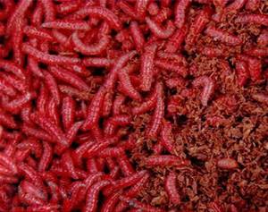 Для получения красных червей используют пищевой краситель нужного цвета. Перед тем как покрасить опарыша в красный цет, небольшое количество пигмента растворяют в молоке или воде. В жидкость помещают личинок и оставляют там на 5 минут. После этого червей следует подсушить.