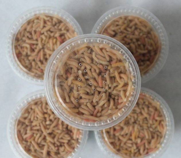 - Когда личинки достигают в длину 8 мм, их перекладывают в отдельную тару, однако продолжают кормить мясом.