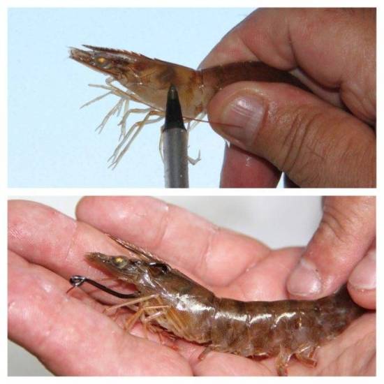 Для обеспечения более дальнего заброса, следует нанизывать креветку под её подбородком, так чтобы острие крючка пролезло через центральную часть головы (панциря) между важными органами. Недостаток – при таком способе насаживания, креветки быстро гибнут.