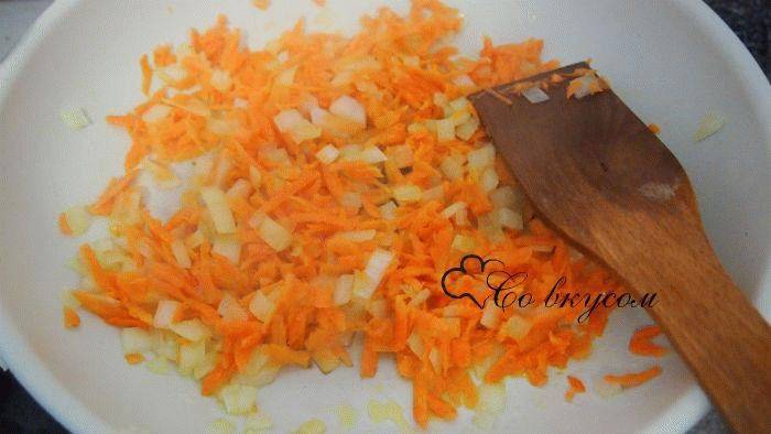 3. Лук пассеруйте в разогретом масле до прозрачности. Добавьте к нему морковь и обжаривайте на среднем огне. Влейте в овощи 50 мл воды и тушите до готовности.