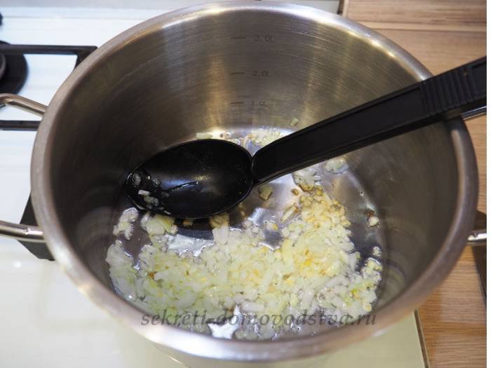 3. В толстостенную кастрюлю налить подсолнечное масло. Поставить на медленный огонь для разогрева. Высыпать кубики лука в посуду и обжарить до золотистого цвета. Следите, чтобы они не горели, постоянно помешивайте содержимое. Приготовьте горячую воду.