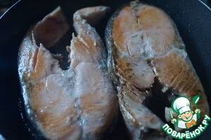 Стейки лосося посолить и оставить на 15-20 минут. Потом обжарить с двух сторон на растительном масле до румяности.
