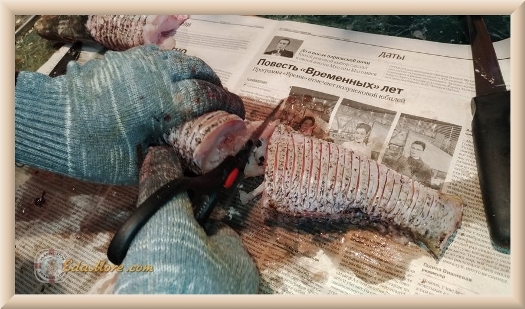 - Вспарывается брюхо, убираются внутренности. При необходимости — отсекается голова.