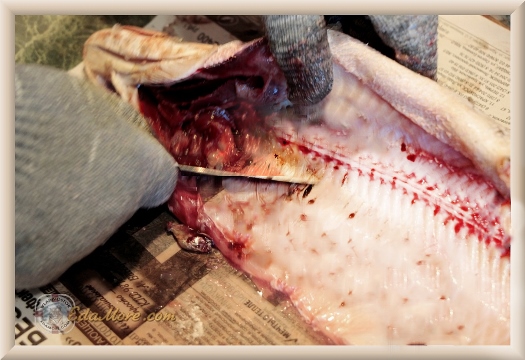 Важно не повредить желчь, иначе можно испортить продукт. Пищевод вынимают вместе с жабрами, оставляя голову