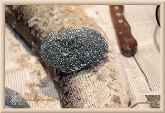 Чешуя. Для чистки тушки используйте скребок, вилку или заостренный нож. В процессе очистки от чешуи нож держите слегка наклоненным, чтобы не порвалась шкурка. Выполнять движения необходимо против роста чешуи. Намного быстрее очистить рыбу от чешуи, натерев ее на мелкой терке. Перед тем как начать “пилинг”, вы можете на некоторое время замочить его в горячей (не кипящей) воде — не слишком надолго, иначе кожа потрескается.