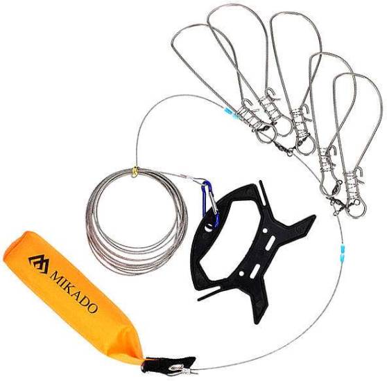 Кукан Микадо AMR03-003-SET собран на основе металлического кабеля. На одном конце троса карабин, с помощью которого кукан можно закрепить на берегу или на уключине лодки, на другом конце троса есть специальный поплавок, указывающий положение кукана в воде. Кукан оснащен пластиковой катушкой, на которую удобно наматывать металлический трос. 5 металлических зажимов для рыбы прикреплены к тросу с помощью металлических антабок.