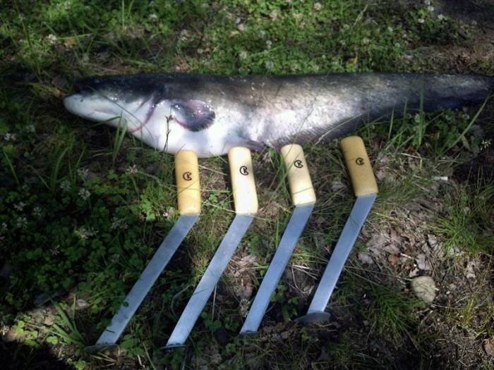 - простота изготовления – для того чтобы своими руками сделать такое приспособление для ловли сома, нужно лишь найти нужный нож и соединить его с пятаком и ручкой, а вот с деревянным работы будет больше;