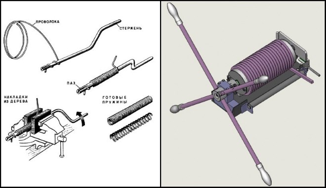 Навивать спираль легче с помощью приспособлений, конструкция которых зависит от размеров и жесткости пружины