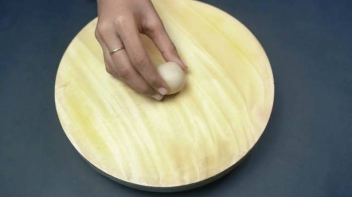 - Затем необходимо взять небольшой кусок теста и скатать его в шарик.