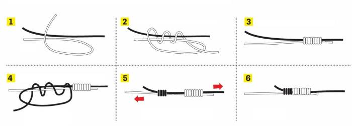 Вязку этих крепких соединений можно освоить за короткое время. Есть много способов, объясняющих как привязать леску к шнуру.
