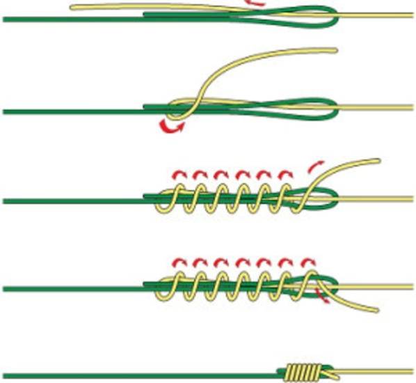- Ходовым концом лески, производится обматывание вокруг 2-ой лески более 5 раз. В исходном витке необходимо оставить открытую часть в виде малеханькой петельки.