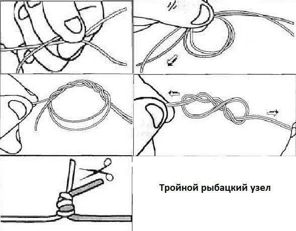 - Затем вяжем из обоих лесок обычный узел, продевая леску 3 раза