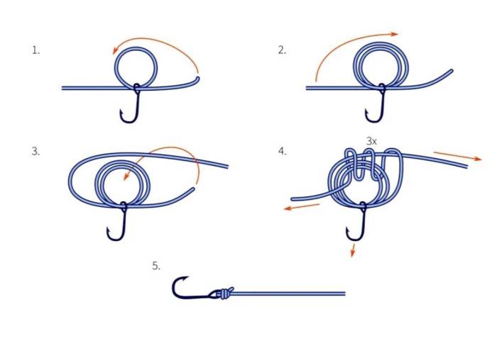 Этот способ позволяет довольно быстро и прочно привязать оснастку, благодаря этому его хорошо использовать в местах, где часто случаются зацепы. Немного неудобно использовать узел с длинными поводками, но благодаря прочности, на это можно закрыть глаза.