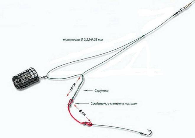 Монтаж несимметричной петли дело кропотливое и ответственное. Заранее приготовьте необходимые составляющие оснастки. Это отрезок лески, кормушка, вертлюг и поводок. Вязка проводится в несколько этапов.
