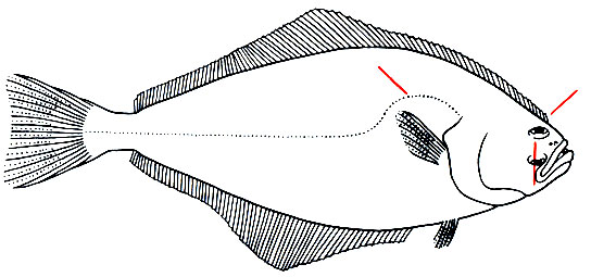 Окраска. Глазная сторона тусклого зеленовато-коричневого цвета, иногда почти черная; слепая сторона жемчужно-белого цвета.