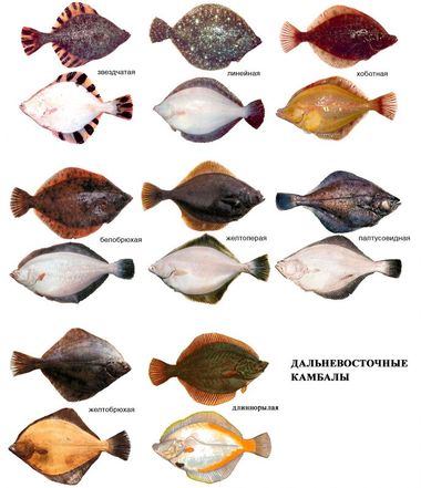 Камбала является хищником, который живет в море. Эта разновидность рыб включает около 60 подвидов. Для всех них свойственно плоское туловище, бока которого находятся в нижней и верхней плоскости. Так, глазницы камбалы находятся на боку сверху, а не на спине. Кожный покров ее почти лишен чешуи, снизу светлый, а наверху темный.