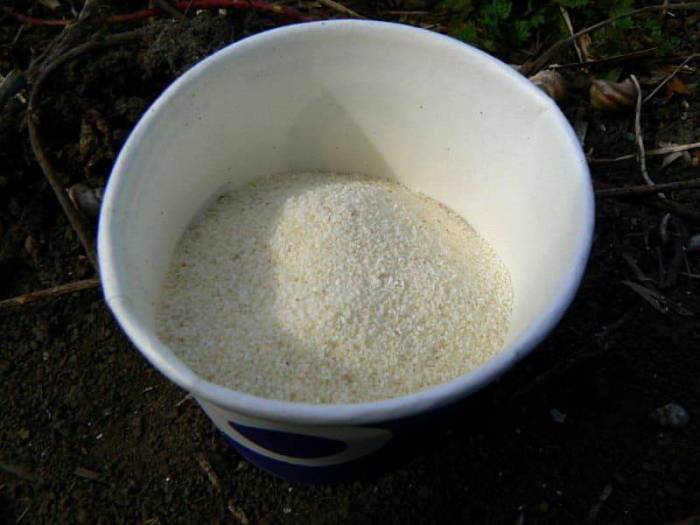 - После истечения указанного срока приманка перекладываются в чистую кастрюлю, в нее добавляется один стакан манки и по два стакана ячневой и кукурузной крупы.