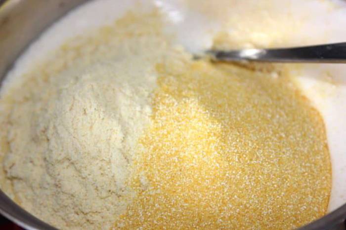 - Сначала берётся пшеничная мука (её нужно 1 стакан) и кукурузная (3 стакана). Это всё смешивается воедино, а потом заливается водой. Смесь должна быть густой и напоминать сметану.