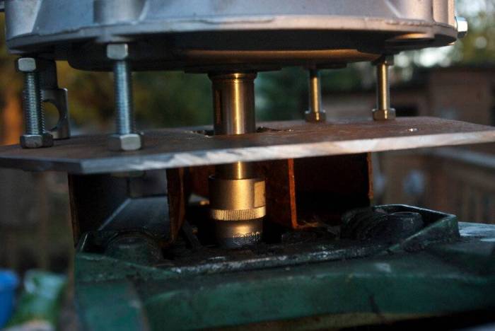 Дальше переборка, дефектовка, сборка обратно, и, наконец — запил. Значицца, колхозники все делают просто и сурово. На вал двигателя, на шпонку сажается гаечная головка torx на 22, и на вертикальный вал тоже прессуется еще одна головка. Все это соединяется квадратом, и, представьте себе, исправно работает. Некоторые, особо упоротые, обтачивают напильником хвостовик колена под шестигранник.
