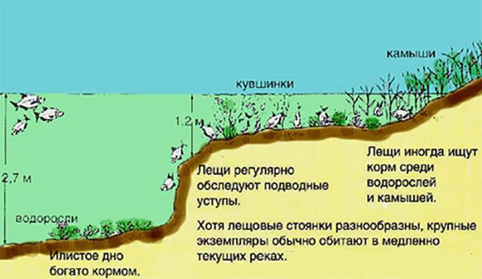 Это глубоководная рыба, которая большую часть времени проводит в ямах глубиной до 12 м. Для поиска пищи лещ выходит к берегу или на отмели. Он любит участки с сильной прибойной волной: там течение постоянно размывает дно и много личинок на поверхности. Отличные места – участки с тихим течением.