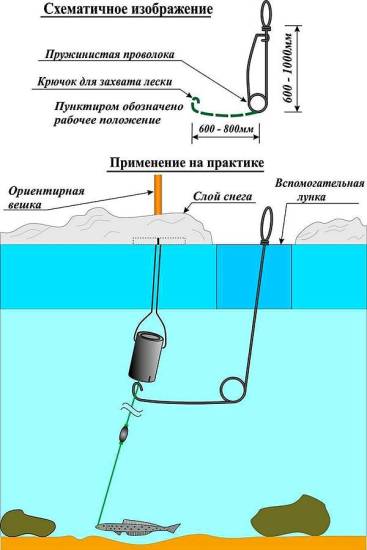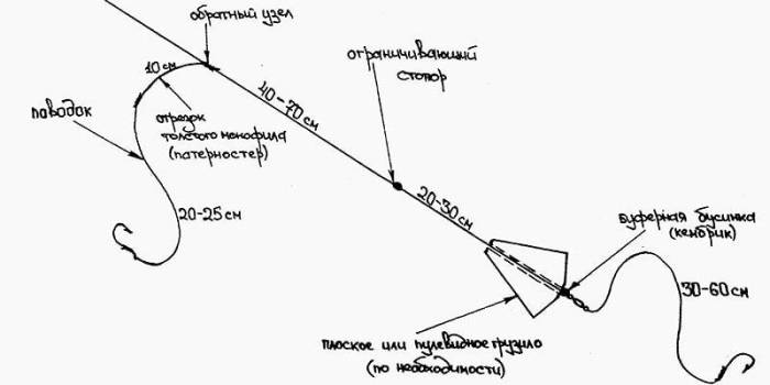 В конструкции , удилище мало что меняет. Снасть монтируется аналогично описанному выше варианту, за исключением того, что основной лески требуется значительно меньше. (Из расчета: глубина в месте лова и максимум 5 метров запаса).