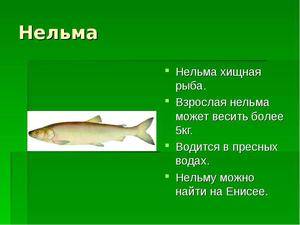 Нельма – речной хищник и самый крупный представитель лососевых. Питается мелкими рыбешками (например, корюшка, ряпушка, налим, плотва). Длина рыбины может превышать одного метра, а вес достигать половины центнера. Но в большинстве случаев попадаются особи весом 5−8 кг.