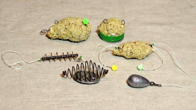 Перед забросом снасти пружина набивается прикормкой, а на крючки насаживаются шарики из пенопласта. В результате получится, что кусочки будут находиться в толще воды над кормушкой из-за положительной плавучести. Карась обязательно заинтересуется содержимым кормушки и начнет поедать ее содержимое.