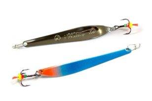 - Пилькеры – уловистая приманка представляет из себя тяжелую болванку со впаянными крючками. Такая блесна в основном предназначена для ловли в отвес с большой глубины. Огромной популярностью пользуются пилькеры, производством которых занимается фирма SPRO, особенно те, которые предназначены для ловли на очень больших глубинах, такие как «Norway King Banana Perk» или «Spitzkopf Pro».