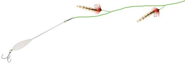 Первый стример крепится на 5-7 сантиметровом поводке в 25-30 сантиметрах от вертлюжка с застежкой. Второй стример — чуть выше, на том же расстоянии и на таком же поводке. К вертлюгу без застежки привязывается основная леска. При ловле спиннингом , чтобы повысить чувствительность, можно использовать не монофильную леску, а шнур.