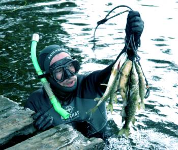 Вечером того же памятного дня мир дайвинга открыл нам еще одну свою привлекательную страницу. Достав из багажника автомобиля компактное пневматическое ружье со стрелкой-гарпуном, Леша отправился на подводную охоту. Вернулся он через пару часов с двумя крупными горбатыми окунями и полуторакилограммовой щучкой. И мы, завороженные, слушали его рассказ о том, как с помощью подводного фонаря он нашел у дальнего безлюдного берега глубокий омут. Как затаился на трехметровой глубине за ветвями утонувшего дерева, где сначала выследил щуку, а потом и окуней, вышедших на ночную охоту…