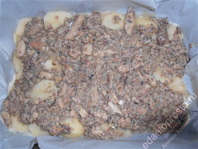 6. Слить сок из консервов, размять вилкой и распределить по луку.